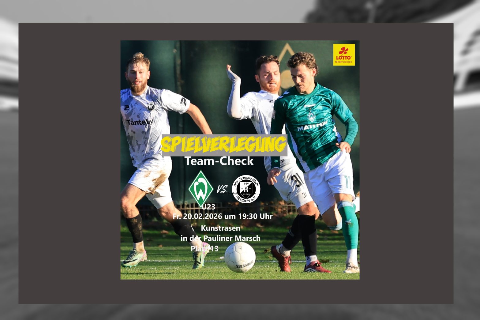 „BSV Rehden testet jetzt witterungsbedingt am Freitagabend bei Werders U23-Talenten.“ Rehden – Am Freitag, 20. Februar, um 19:30 Uhr, steht für den BSV Rehden ein weiterer anspruchsvoller Test in der Wintervorbereitung an. Auf dem modernen Kunstrasen im Nachwuchsleistungszentrum in der Pauliner Marsch wartet mit den U23-Talenten des SV Werder Bremen ein spielstarker Gegner, der für Tempo,… ***Hochkarätiger Team-Check in Bremen*** weiterlesen